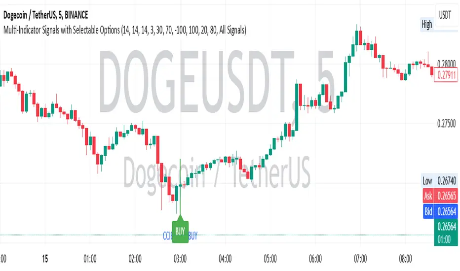 This Pine Script is a multi-indicator trading strategy designed to generate buy/sell signals based on combinations of popular technical indicators: RSI (Relative Strength Index) , CCI (Commodity Channel Index) , and Stochastic Oscillator . The script allows you to select which combination of signals to display, making it highly customizable and adaptable to different trading styles.