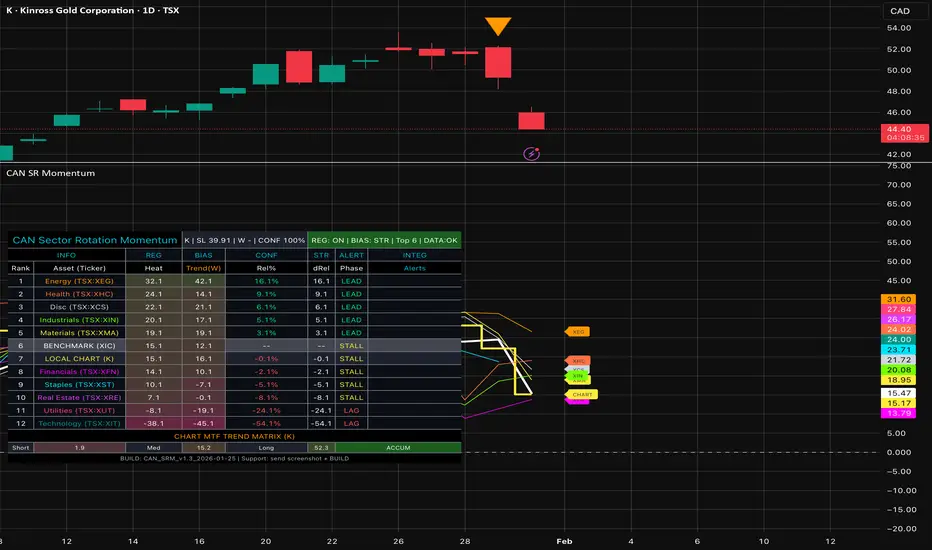 Sector rotation + market alignment dashboard using normalized Heat (-100..100) with higher timeframe confirmation, confluence scoring, optional whale markers, and an MTF matrix.