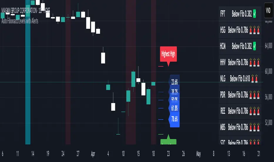 This Pine Script™ indicator is designed specifically for traders monitoring the Vietnamese stock market (HOSE, HNX). Its primary goal is to automate the tracking of Fibonacci retracement levels across a large list of stocks, alerting you when prices breach key support zones.