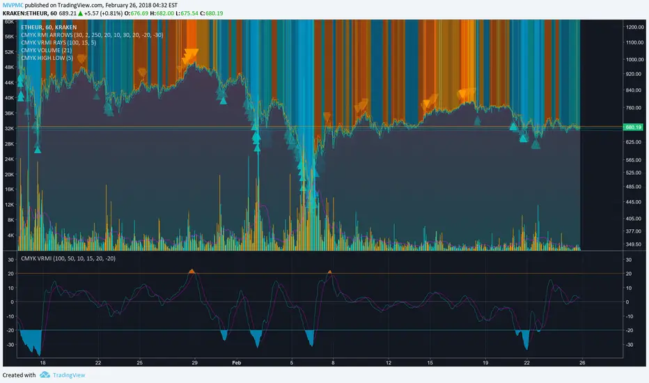 This results in an RSI that is smoother. The input has been changed to the change of a smoothed close multiplied by a smoothed volume.