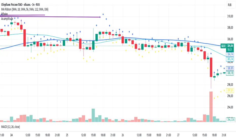 Показывает уровни отклонений от открытия, рассчитанные как среднее максимальных отклонений от открытия за последние N свечей, умноженных на мультипликатор.