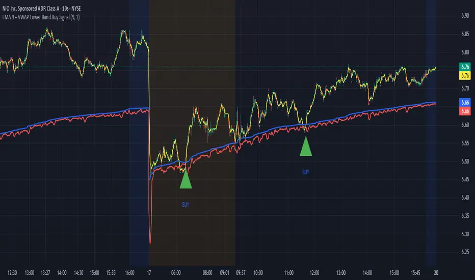 EMA 9 + VWAP Lower Band Buy Signal. It uses Ema 9 and VWAP lower band. Has buy alerts