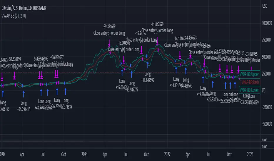 This script uses Bollinger bands but with a VWAP as the source, it uses the high crossing the upper band as a buy signal and a low crossing the lower band as a sell signal