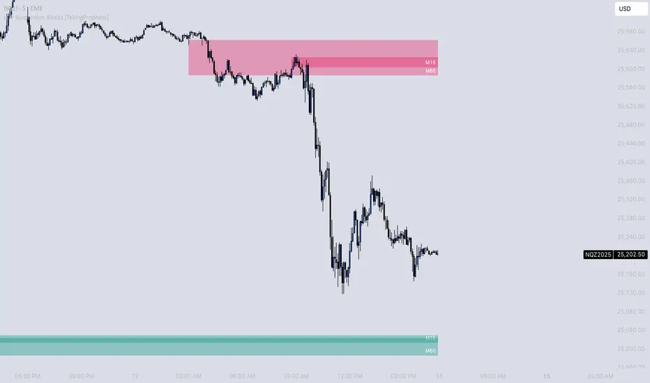Instead of only seeing Suspension Blocks on the timeframe they form, this script identifies valid HTF formations, draws their ranges on your lower timeframe, extends them forward, and manages invalidation automatically. You get higher-timeframe context while staying in your execution environment.