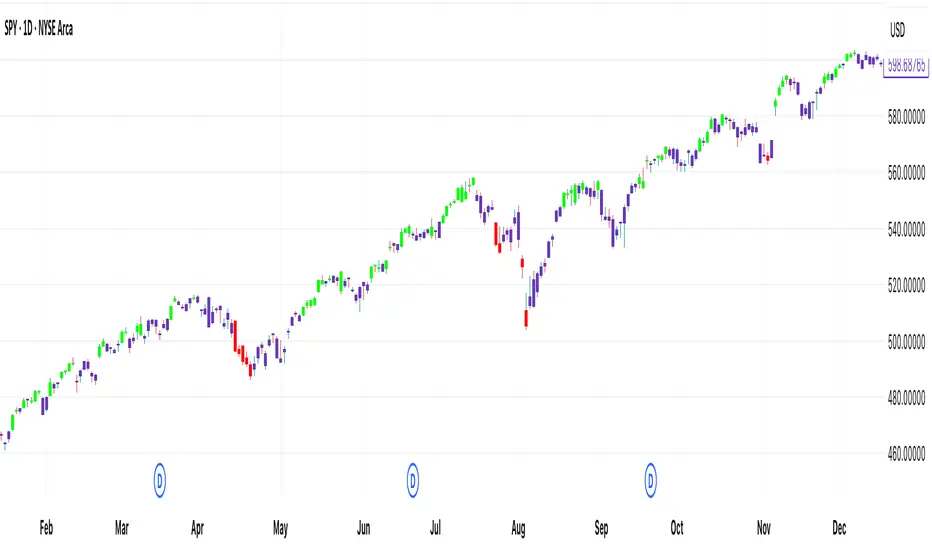 [DEM] Donchian Channels Bars is designed to color-code price bars based on their relationship to Donchian Channel breakouts by comparing short-term and long-term highest high and lowest low levels. The indicator uses two configurable lookback periods (default 1 and 20 bars) and colors bars green when the shorter-period highest high equals the longer-period highest high (indicating an upward breakout or new high), red when the shorter-period lowest low equals the longer-period lowest low (indicating a downward breakout or new low), and purple when neither condition is met. This visual system helps traders quickly identify when price is making significant moves beyond established ranges, with green bars highlighting potential bullish breakouts above recent resistance and red bars highlighting potential bearish breakouts below recent support levels.