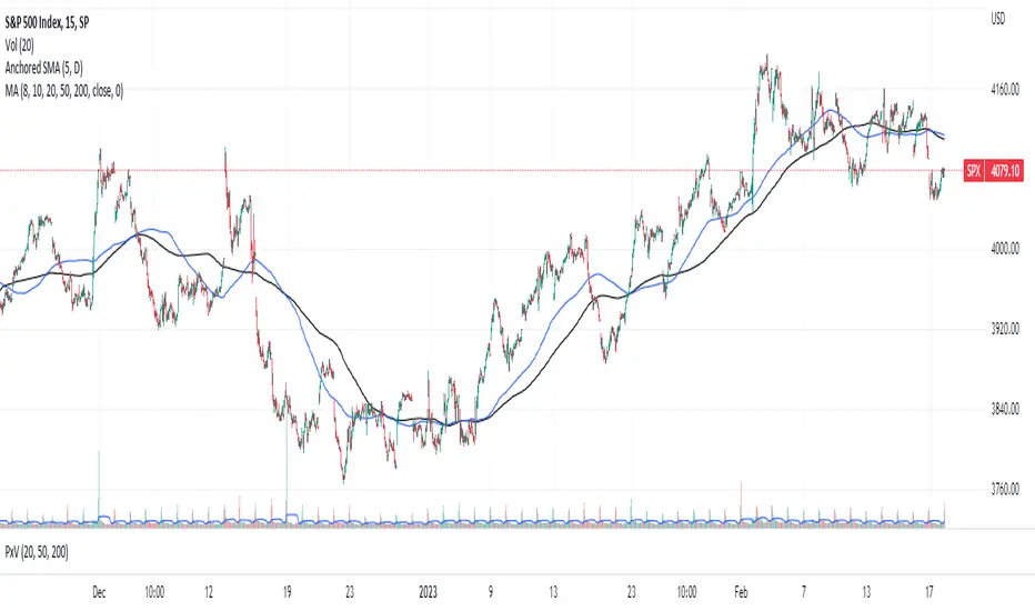 The default setting is for the anchored SMA is the five day SMA. This can be adjusted in the settings to be any amount of ticks in any timeframe you choose from 1 minute to 1 week. The indicator does not hold accurately at timeframes outside of this range. The accompanying chart is the SPX in the 15 minute timeframe with the default anchored SMA settings in blue and the standard 200 tick SMA in black. Now, you could manually adjust the ticks to 130 SMA to fit the same blue line, but why do so when the anchored SMA does it for you?