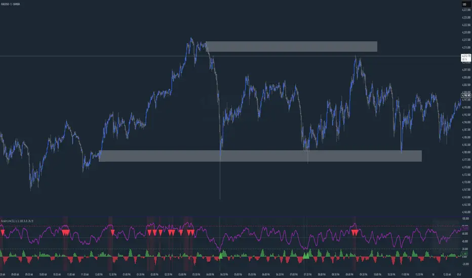 It simplifies multi-oscillator analysis into one clear visual — helping traders recognize potential momentum shifts, exhaustion, and reversal zones.