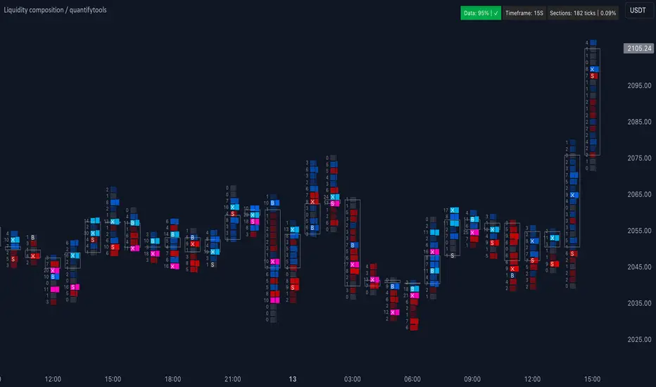Liquidity composition divides each candle into sections that are used to display transaction activity at price. In simple terms, an X-ray through candle is formed, revealing the orderflow that built the candle in greater detail. Liquidity composition consists of two main components, lots and columns. Lots and columns can be used to visualize user specified volume types, currently supporting net volume and volume delta. Lots and columns can be used to visualize same or different volume types, allowing a combination of volume footprint, volume delta footprint and volume profile in one single view. Liquidity composition principally works on any chart, whether that is equities, currencies, cryptocurrencies or commodities, even charts with no volume data (in which case volatility is used to approximate transaction activity). The script also works on any timeframe, from minute charts to monthly charts. Orderflow can be observed in real-time as it develops and none of the indications are repainted.