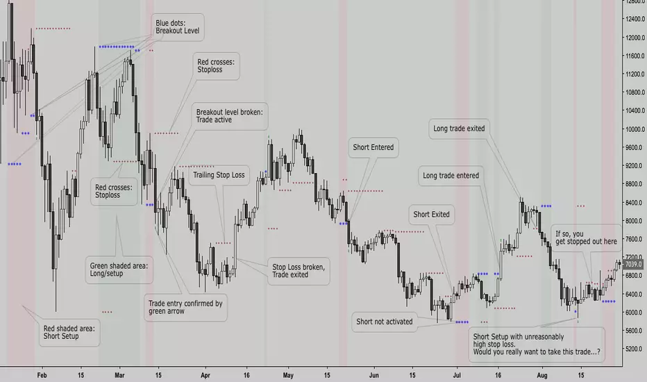 It does not only provide you with buy or sell signals you have to react on quickly, rather, it shows you when a trade setup is active. In this way you can anticipate the break of the breakout level to enter the trade. A trailing stop loss is used to exit.
