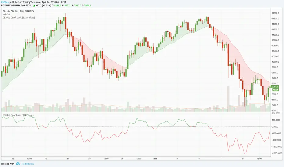 Uses exponential moving averages to indicate whether the market is going up or down, green for up, and red for down.