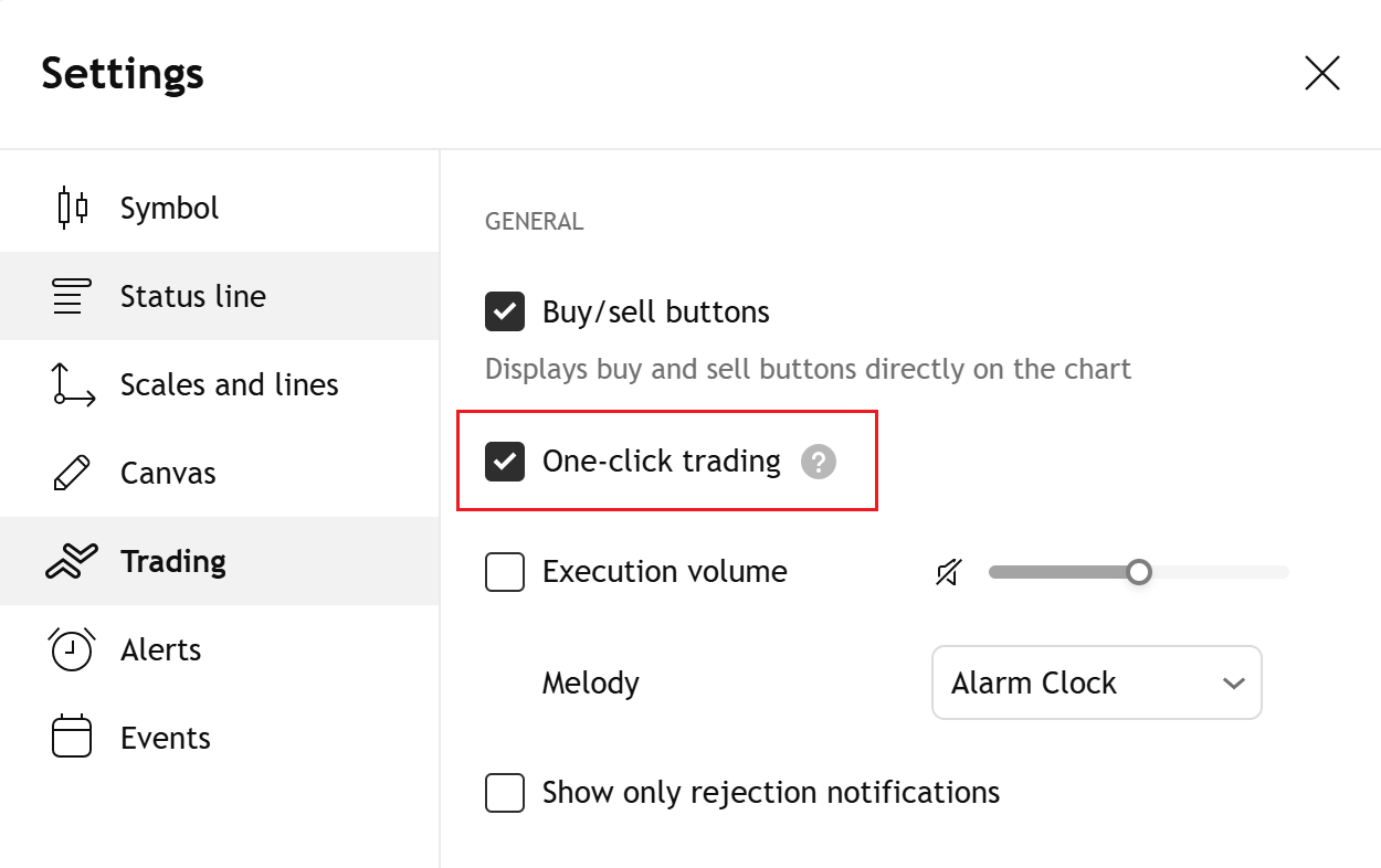 Catatan: Dengan “Trading satu klik” yang diaktifkan, semua tindakan akan dikirim segera setelah diklik. Periksa kembali apakah setiap klik mencerminkan strategi yang Anda inginkan.