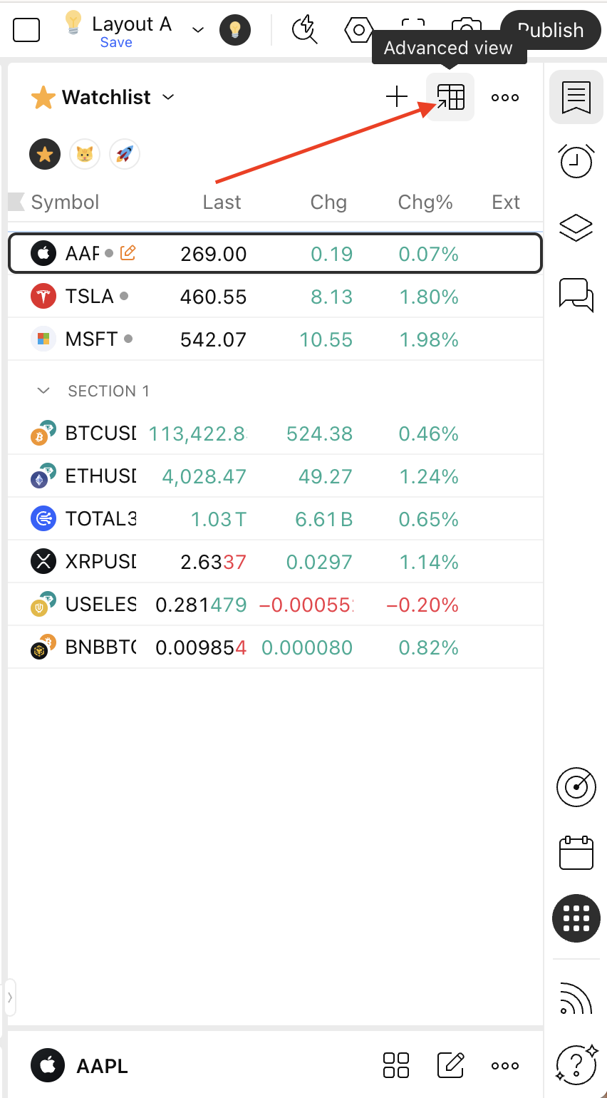Untuk mengekspor daftar pantau anda, pertama, buka daftar tersebut, lalu temukan tombol "Tampilan tingkat lanjut".