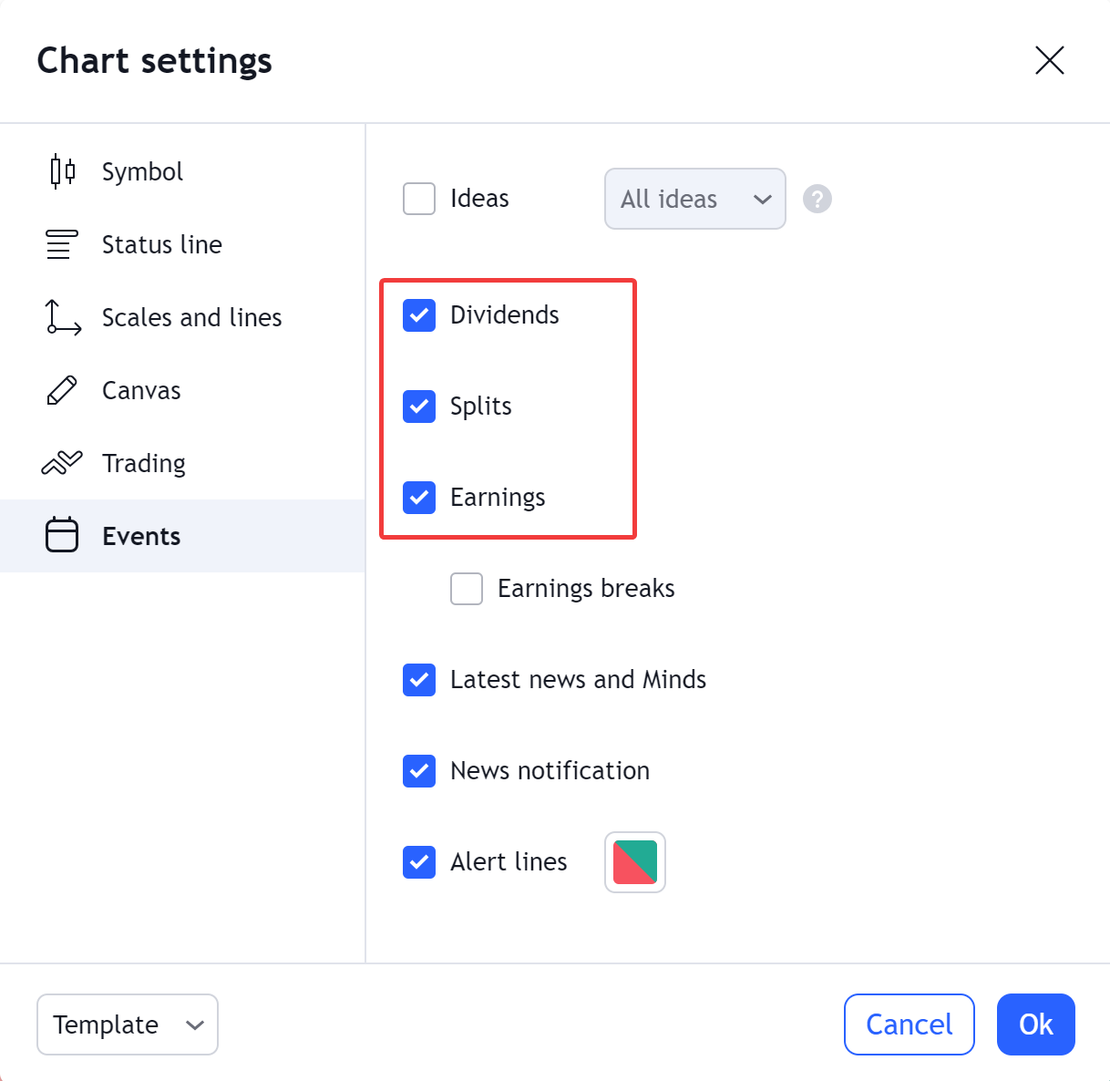 Untuk menyalakan atau mematikan peristiwa ekonomi pada chart, buka dialog Pengaturan Chart, menuju ke tab Peristiwa, dan nonaktifkan atau aktifkan salah satu dari pilihan berikut ini: Dividen, Split, Perolehan.