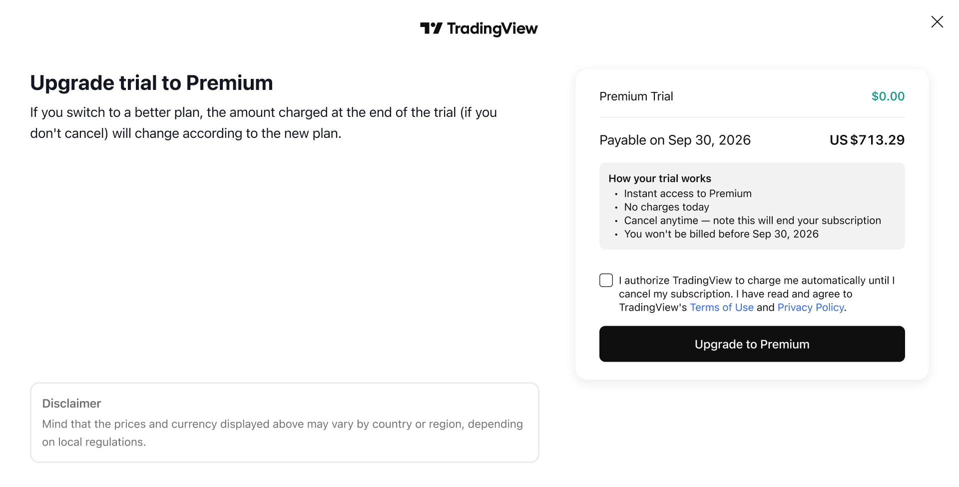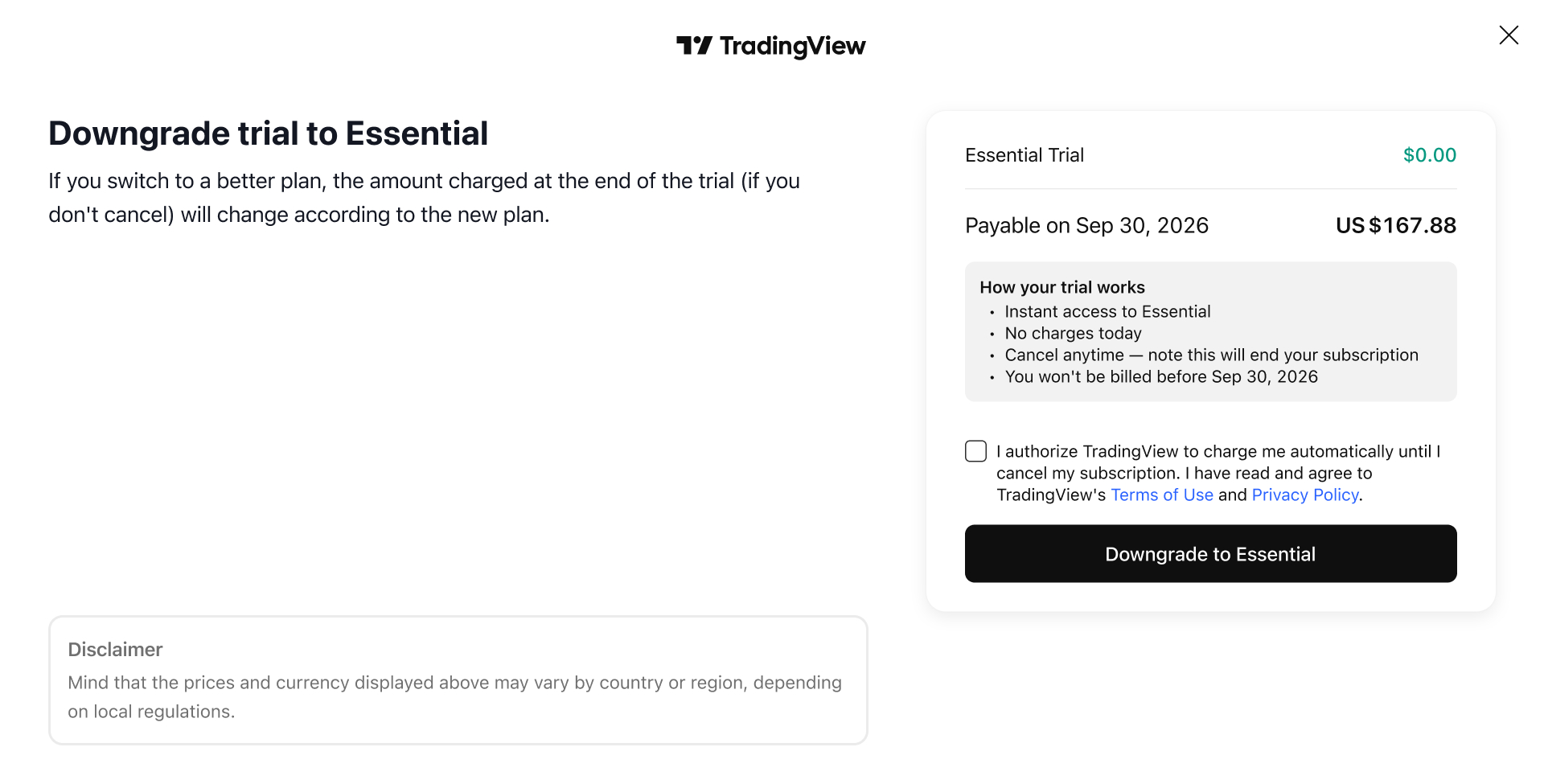 Di TradingView, kami percaya bahwa satu kali percobaan per pengguna sudah cukup bagi pengguna untuk memahami konsep platform kami dan merasakan pengalaman seperti apa saat telah berlangganan. Jika anda ingin mencoba skema lain dan sisa hari percobaan anda belum habis, anda dapat mengalihkan percobaan anda dari Essential ke Plus atau bahkan ke Premium dengan mengikuti petunjuk di bawah ini.
