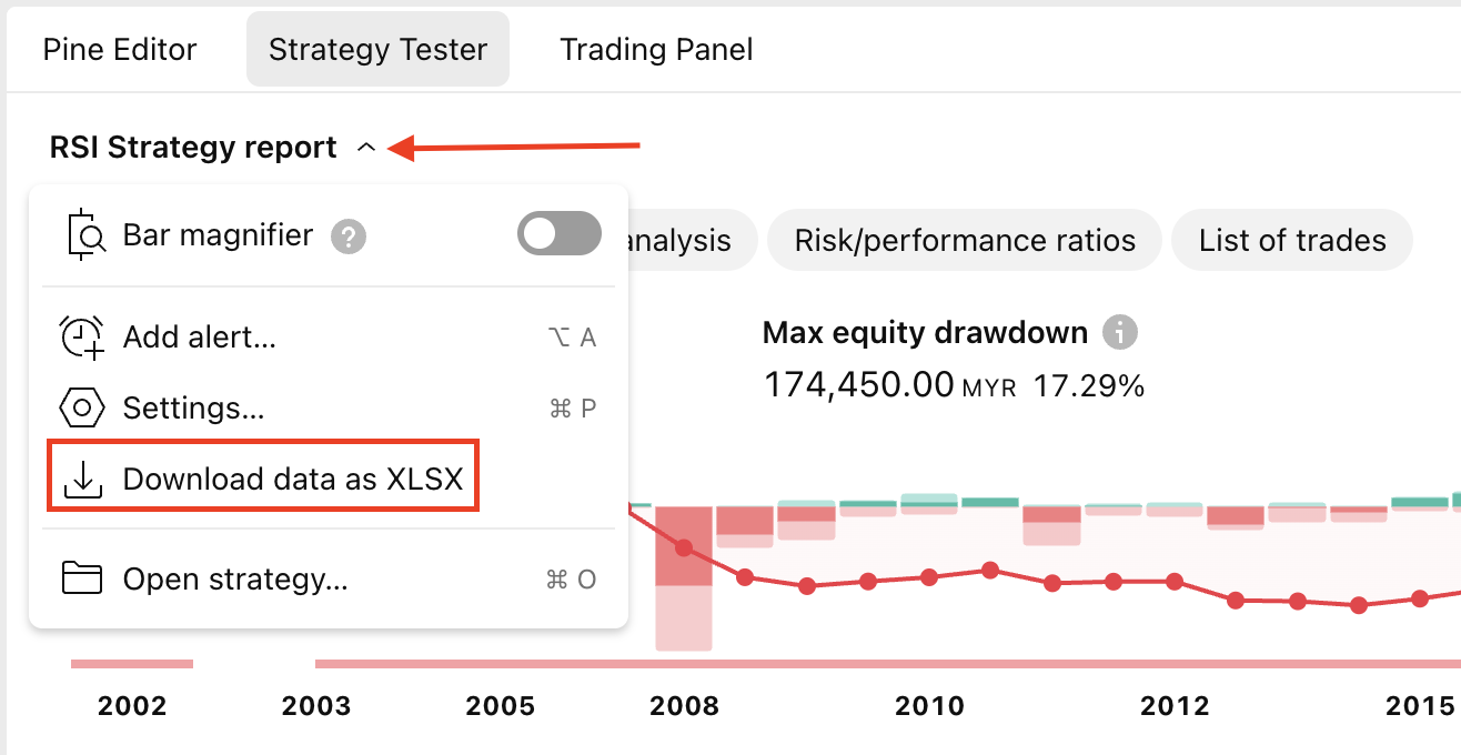 Jika Anda ingin menyimpan data Penguji Strategi, anda dapat menggunakan fitur ekspor untuk mengunduhnya sebagai file CSV. Untuk mengekspor data strategi, klik tombol "Unduh" di Penguji Strategi:
