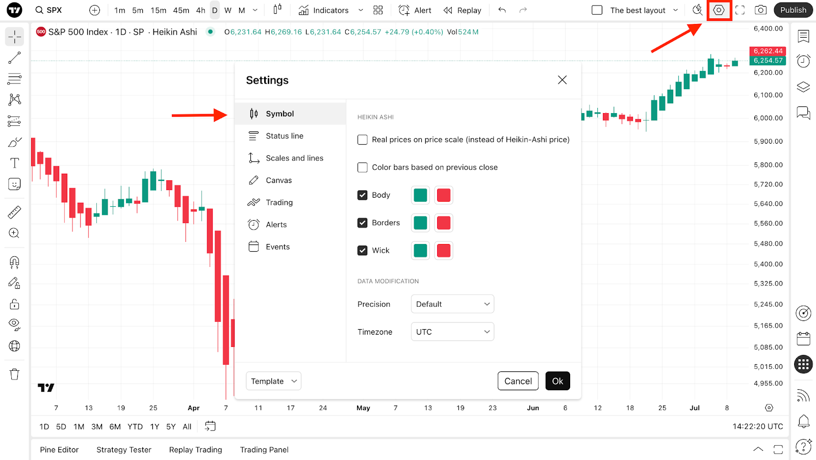 Untuk mengkonfigurasinya agar sesuai dengan strategi trading unik Anda, temukan tombol roda gigi di toolbar atas, lalu buka tab "Simbol".