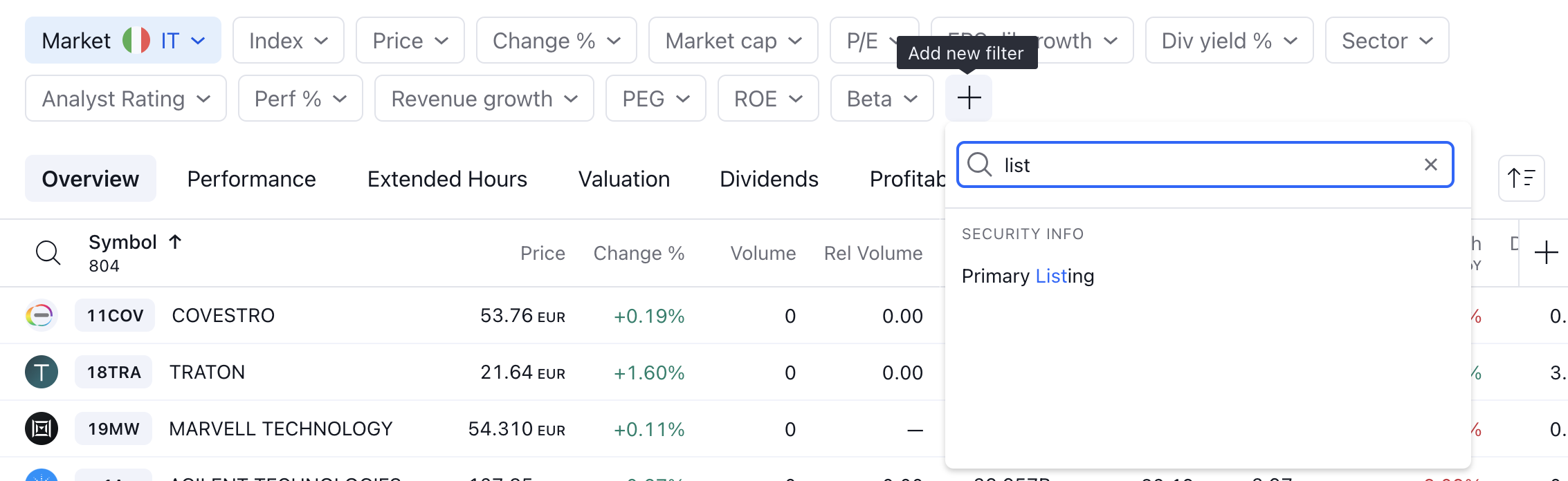 Jika anda hanya ingin melihat simbol dengan listing utamanya di pasar Italia, anda dapat: