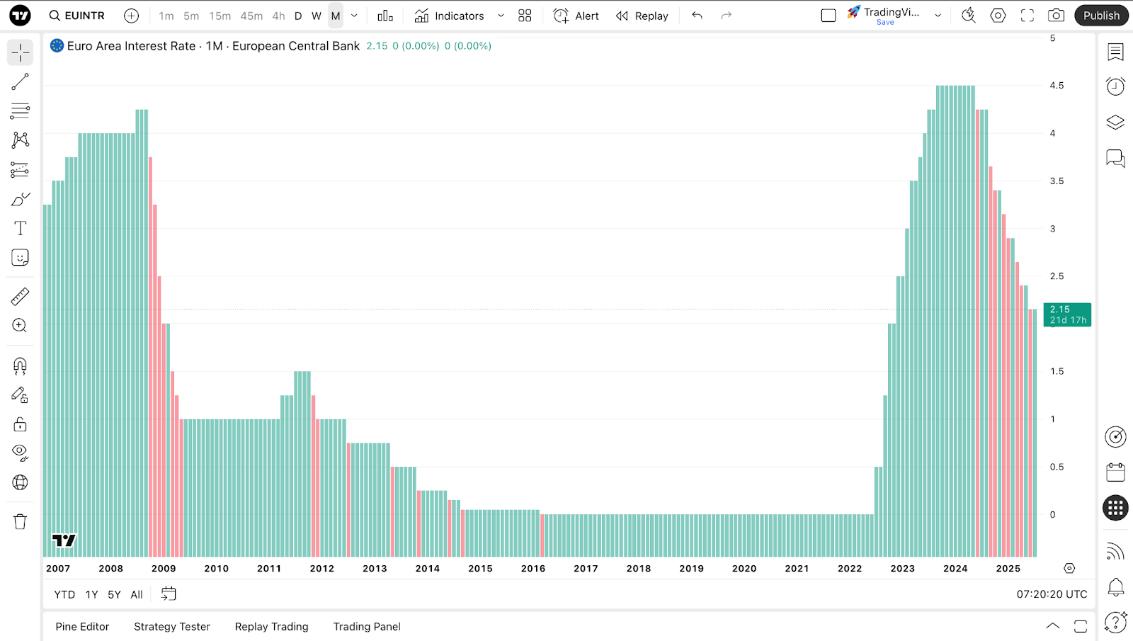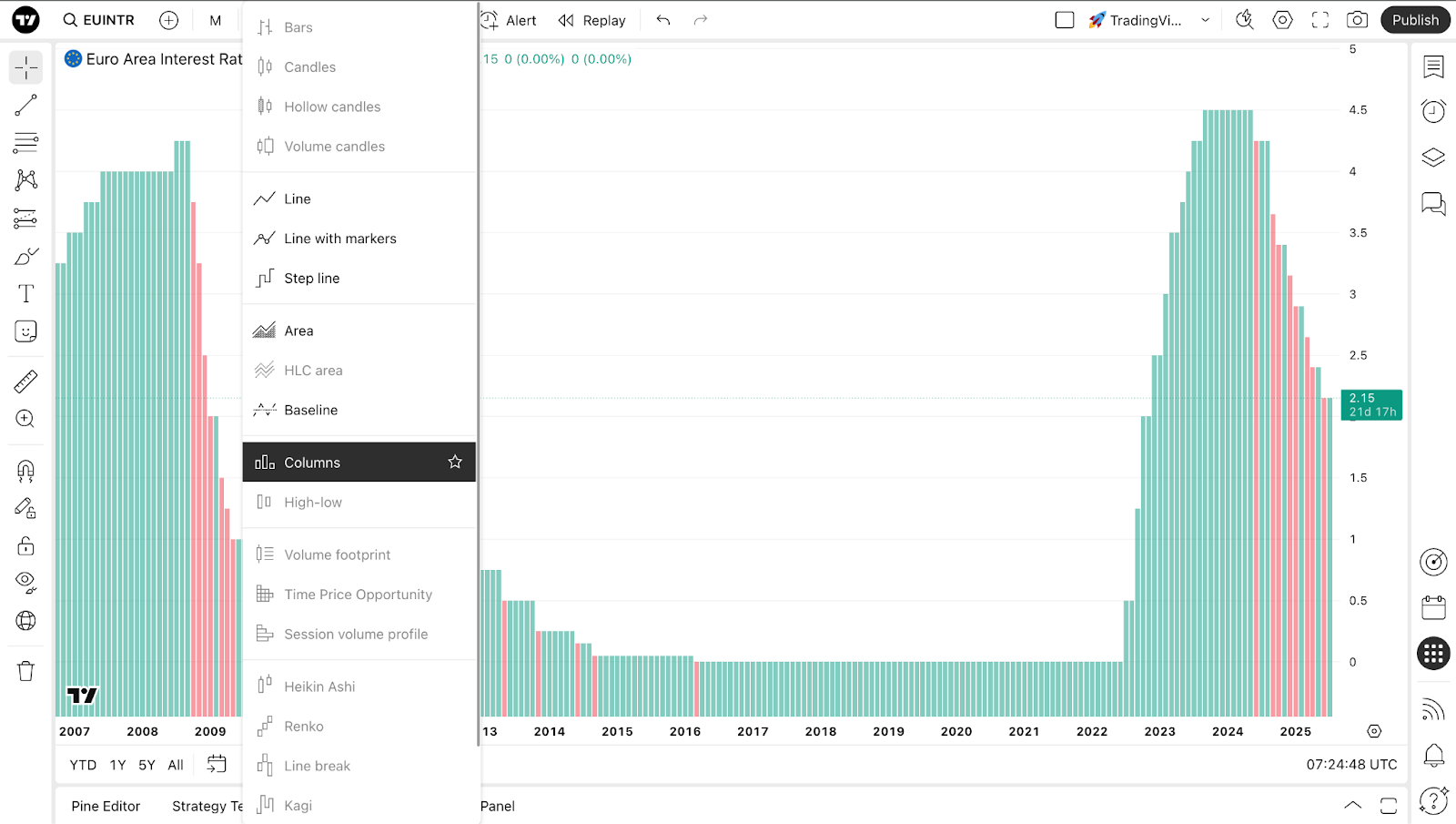 Anda dapat menggunakan chart kolom untuk menampilkan indikator ekonomi seperti PDB, suku bunga, atau tingkat inflasi. Mereka akan muncul sebagai deretan kolom hijau dan merah yang berurutan, membantu Anda dengan mudah melihat tren dan pergeseran makroekonomi.