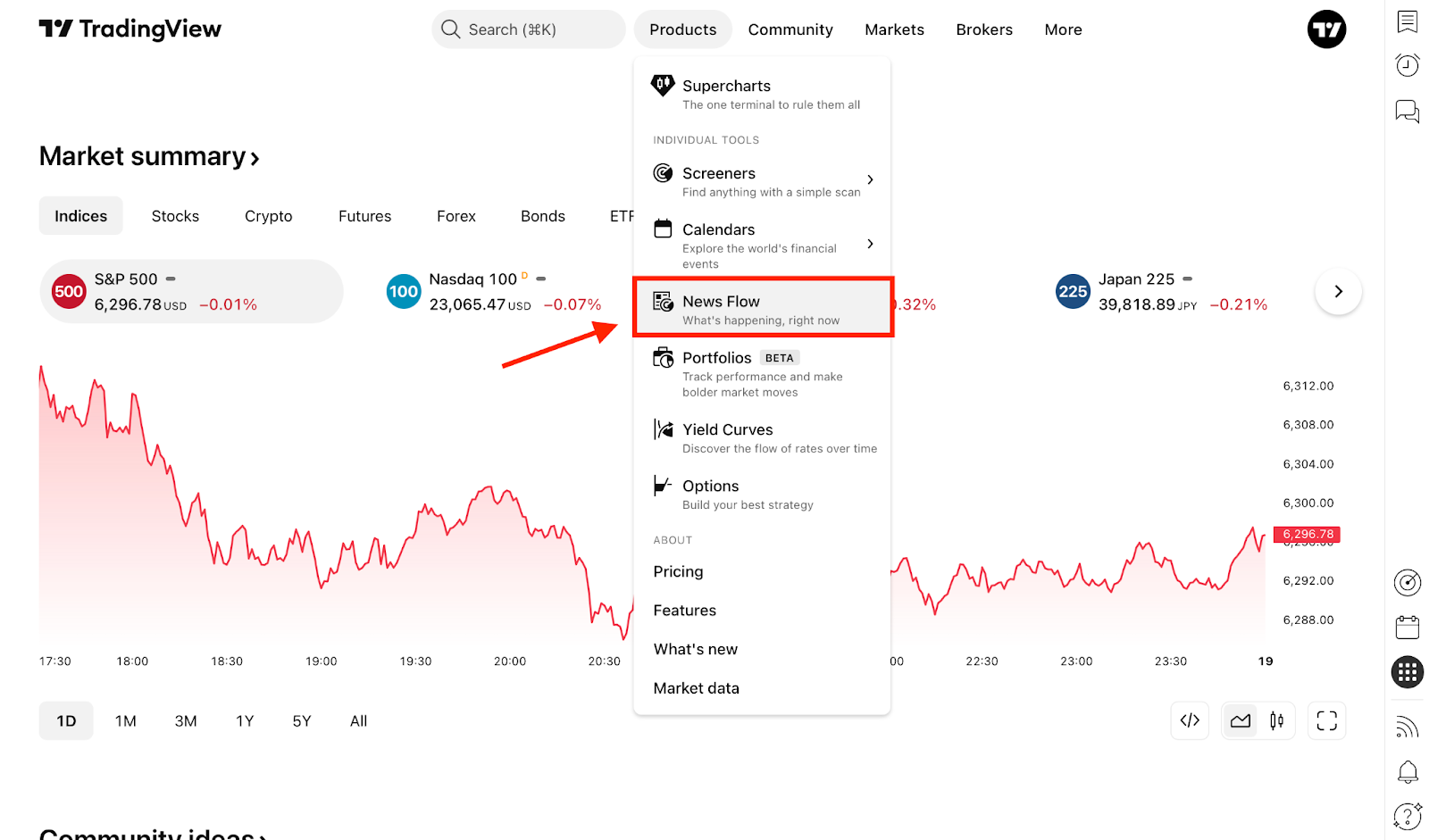 Dari Superchart, temukan tombol "Produk" pada toolbar sebelah kanan dan klik "Aliran Berita".