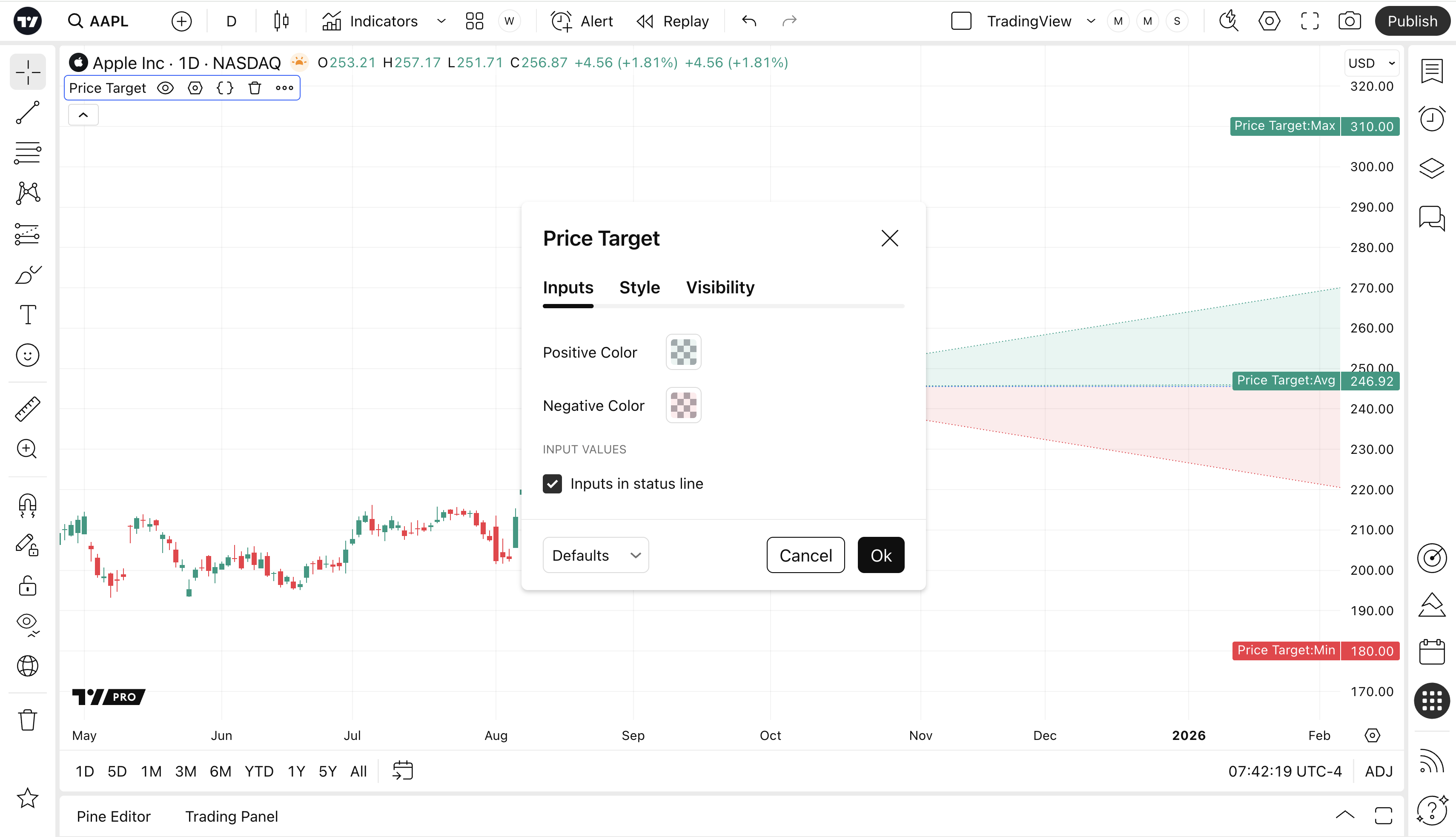 Indikator Target Harga menampilkan prediksi harga untuk simbol saat ini dalam kurun waktu satu tahun. Nilai-nilai tersebut didasarkan pada prediksi harga oleh berbagai analis, yang disediakan oleh penyedia data keuangan kami. Bagian Proyeksi pada halaman simbol menampilkan data yang sama, jika tersedia.