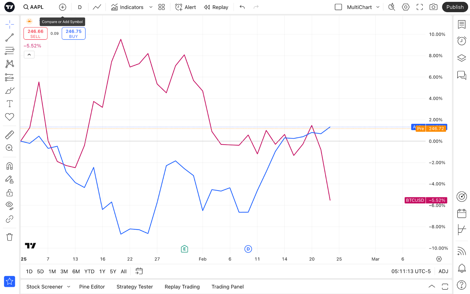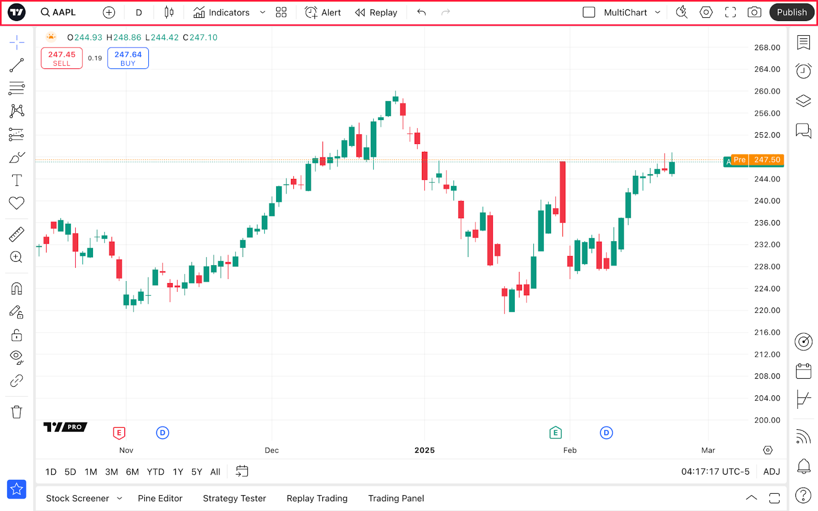 Superchart merupakan inti dari TradingView. Dengannya, Anda dapat melacak perubahan harga, membaca indikator, menerapkan peralatan gambar, dan melihat produk lain seperti Penyaring dan Aliran Berita untuk analisis keuangan yang komprehensif. Dari ruang trading personal Anda, Anda juga dapat berlatih trading dan melakukan trading riil melalui broker tepercaya kami.