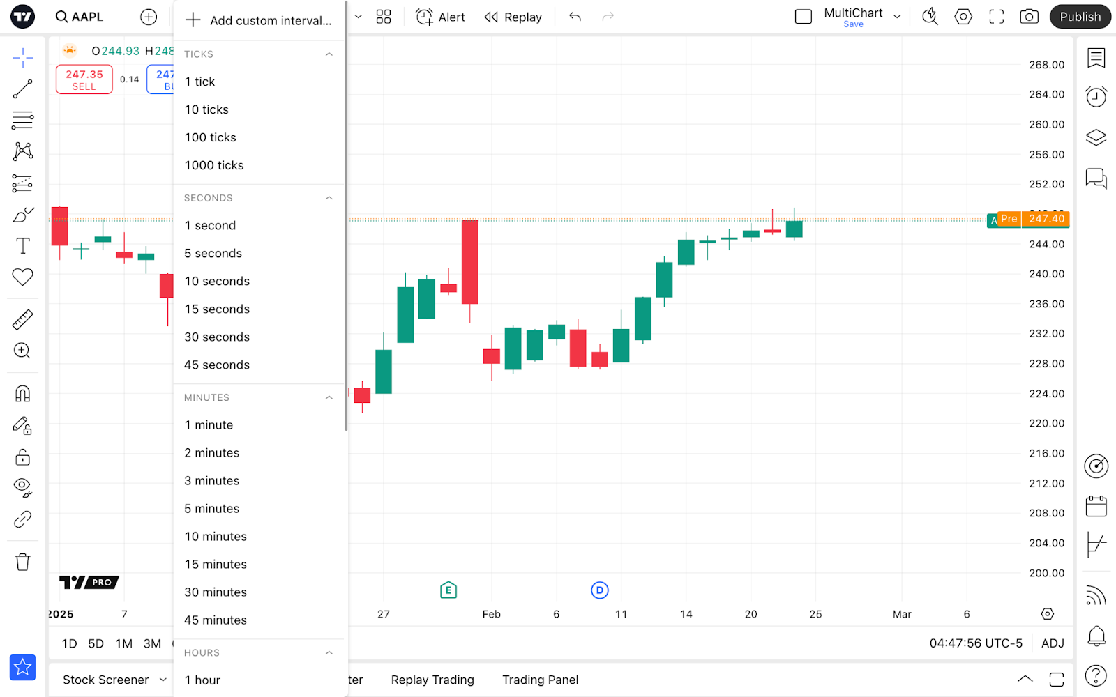 Pada panel ini, Anda dapat beralih antar interval, mengatur zona waktu, dan menyesuaikan skala harga.