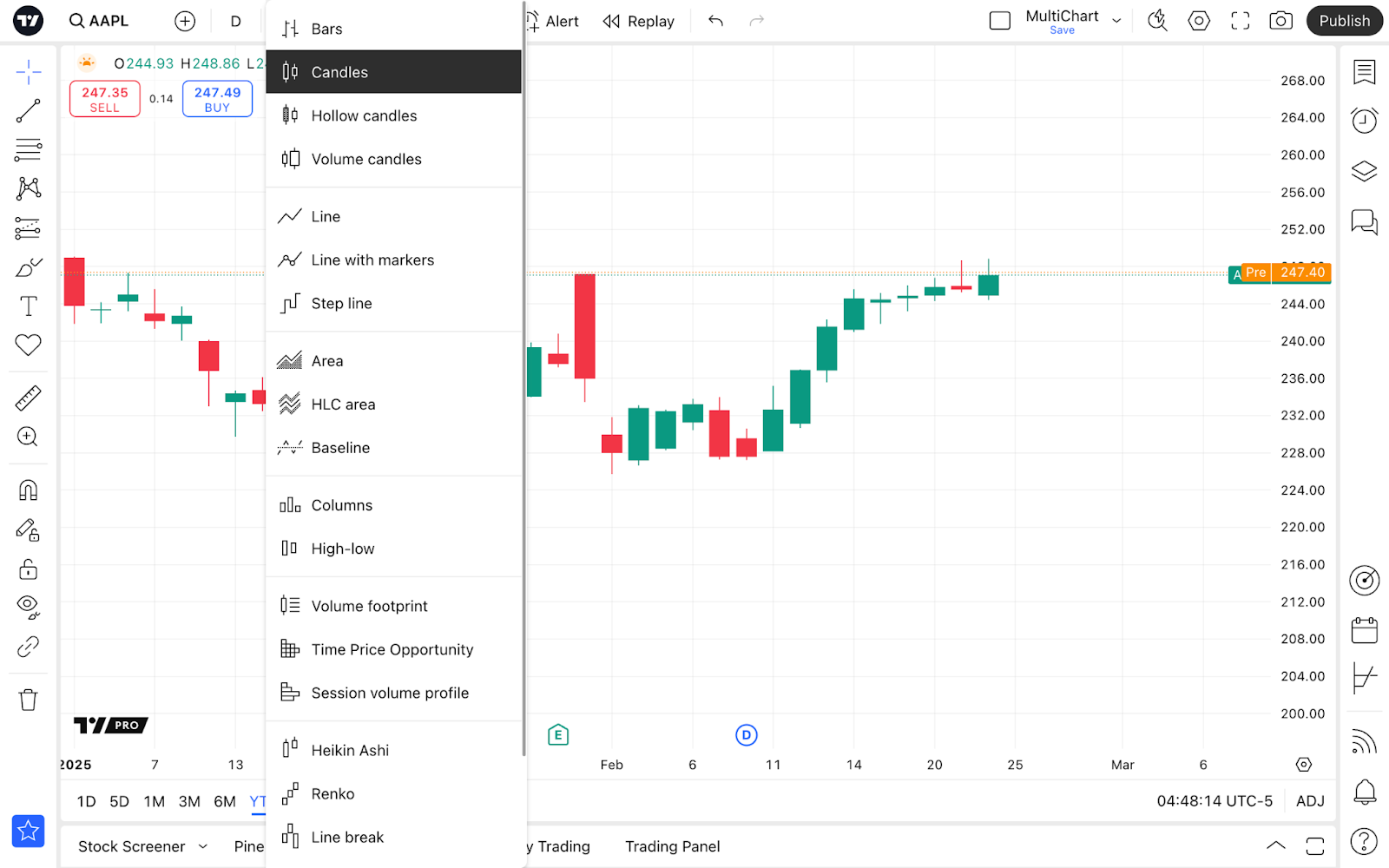 Di sini, Anda dapat memilih lebih dari 20 jenis chart. Masing-masing dapat disesuaikan dengan pendekatan analitis Anda. Pilih mulai dari bar dan candlestick klasik hingga opsi yang lebih rumit seperti chart Renko — jelajahi cara menggunakan berbagai jenis chart .