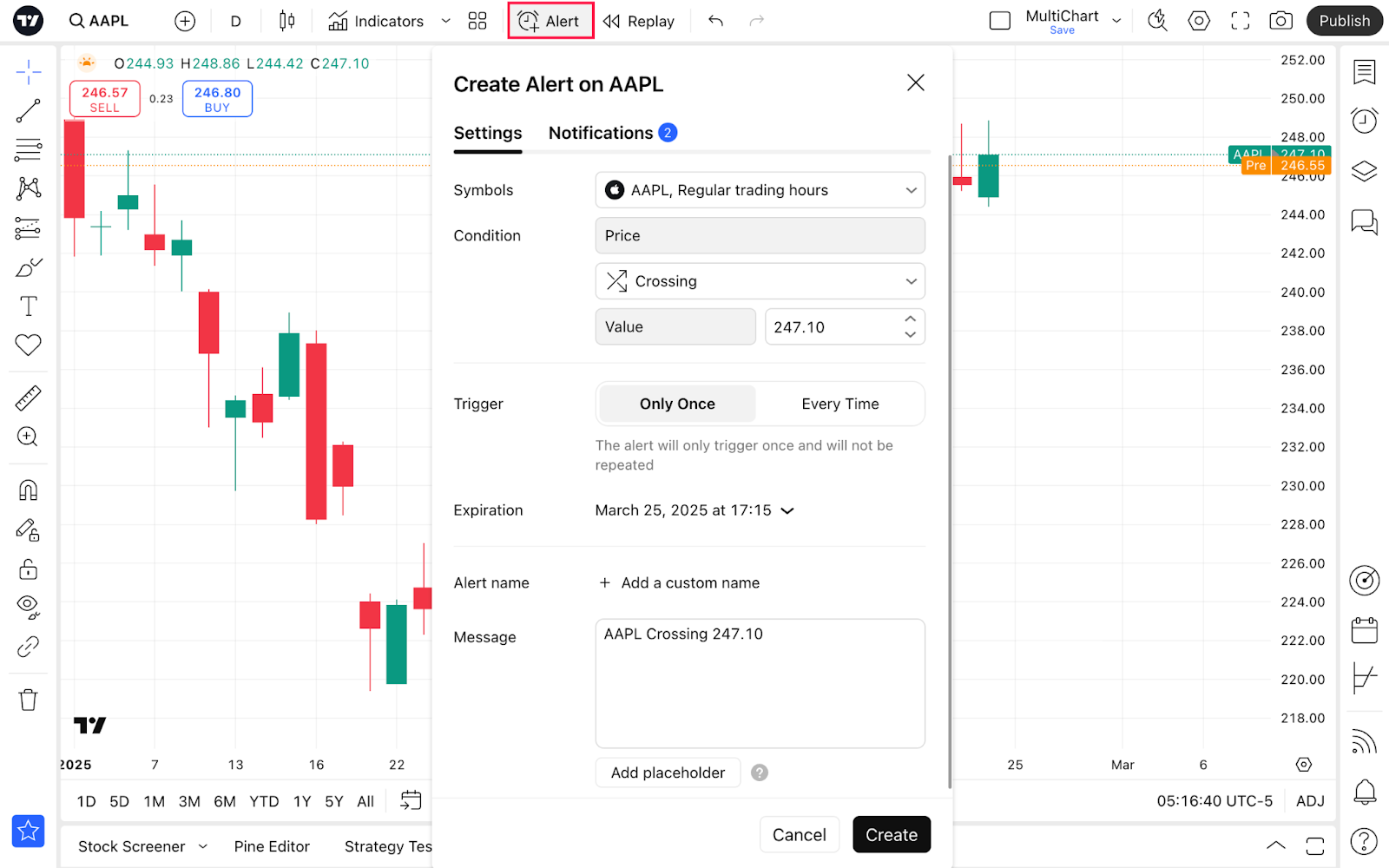 Fitur ini memungkinkan Anda untuk mengatur peringatan dan mengelola notifikasinya. Dengan instrumen penting ini, Anda akan selalu memantau harga, indikator, strategi, atau gambar. Anda dapat memilih kondisi yang akan memicu peringatan, tanggal kedaluwarsanya, meninggalkan pesan di sampingnya, dan banyak lagi.
