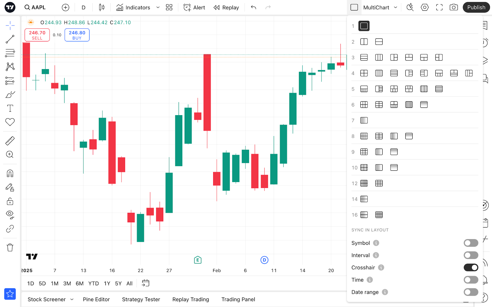 Di menu pengaturan layout, Anda dapat mengkonfigurasi jumlah dan penempatan chart. Pada dasarnya, layout adalah ruang kerja yang disimpan secara terpisah. Setiap chart dalam layout memiliki pengaturannya sendiri dan dapat dikustomisasi secara independen, tetapi Anda juga dapat memilih untuk menyinkronkannya.