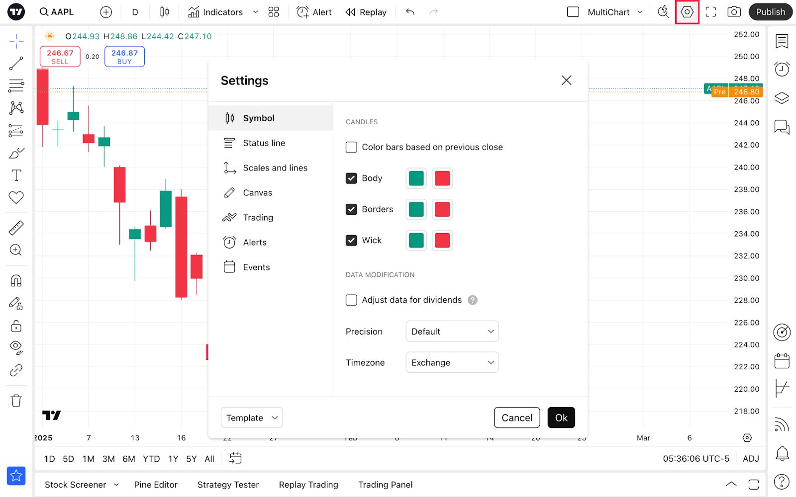 Di pengaturan Zona Waktu, Anda dapat memilih waktu yang akan ditampilkan pada chart. Pilih "Bursa" untuk menyesuaikan waktu dengan bursa perdagangan yang relevan.