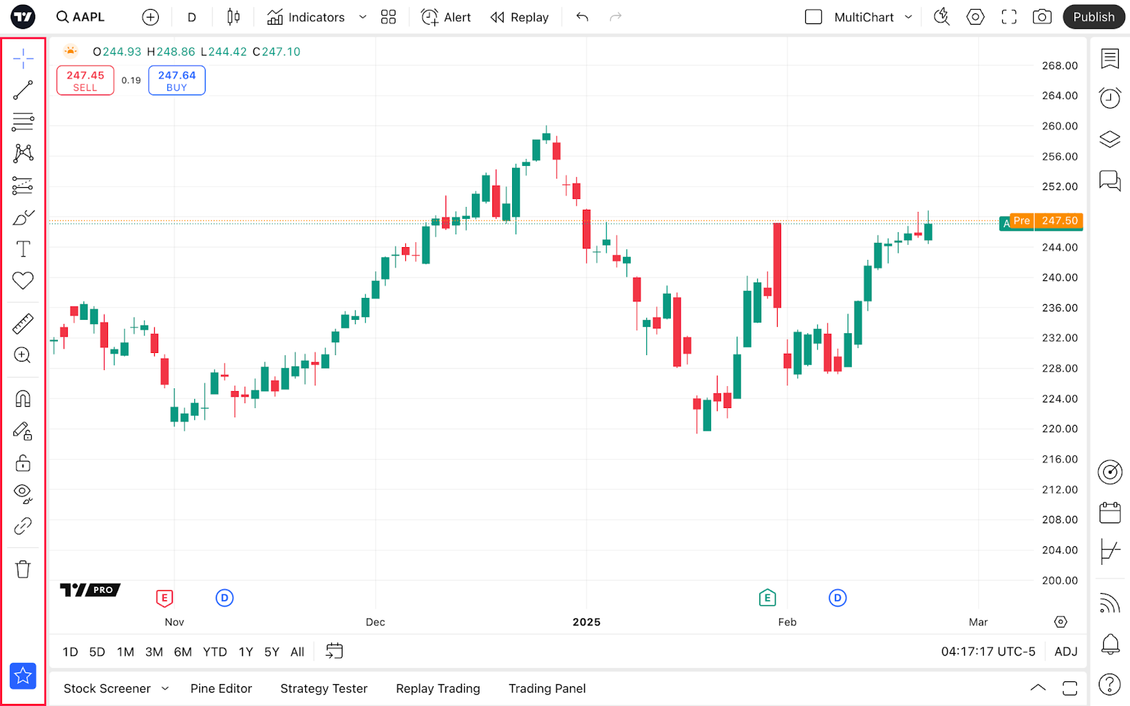 - Peralatan Garis Tren: Pilih garis, kanal, atau pitchfork untuk menandai arah pergerakan dan level harga