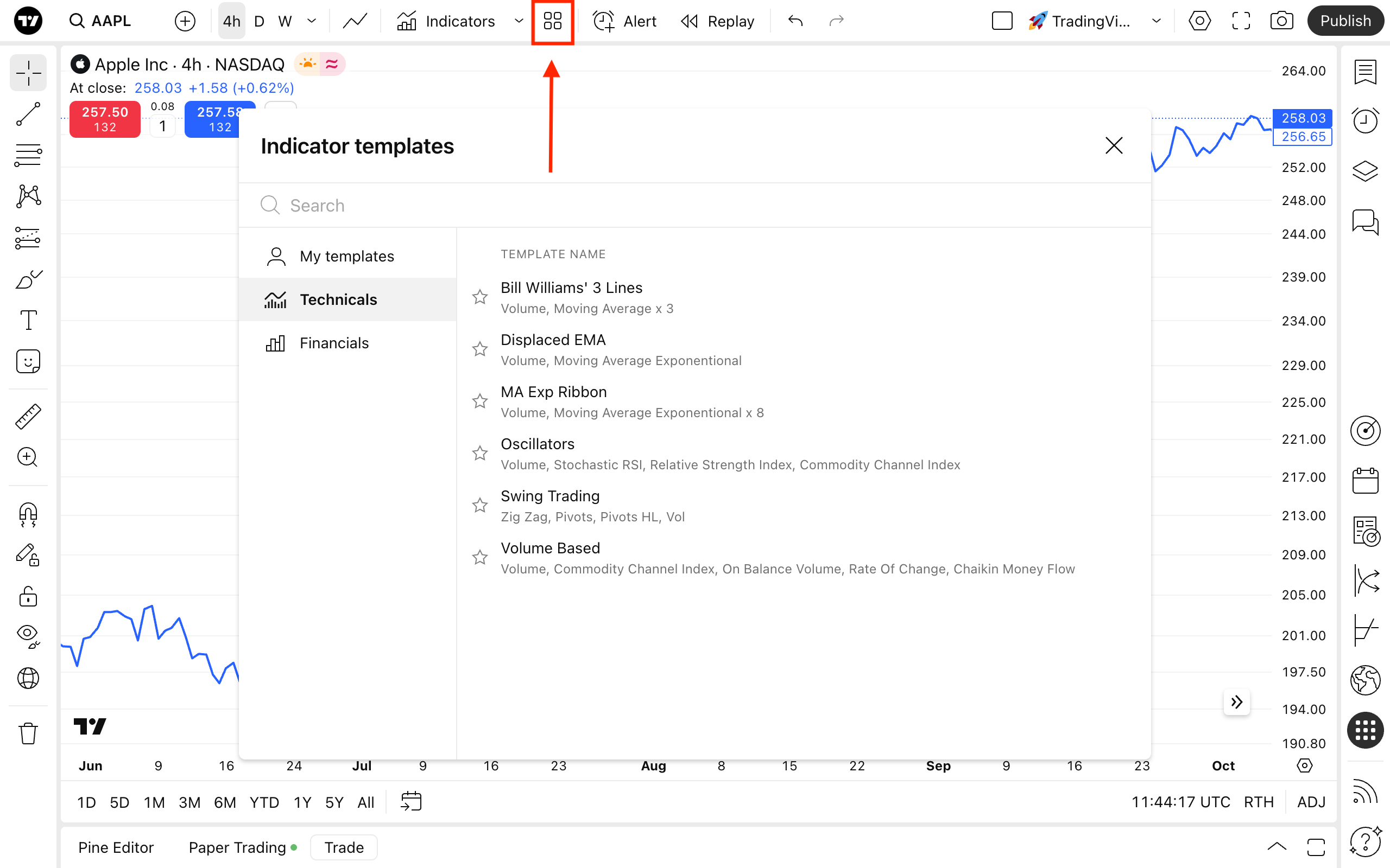 Dengan template indikator, Anda dapat menyimpan indikator pilihan Anda untuk digunakan nanti. Saat menyimpan, Anda juga dapat mengingat simbol dan intervalnya sehingga Anda dapat memuatnya secara bersamaan dengan template. Klik "Buka template" untuk melihat jendela "Template Indikator" dan mengelola template Anda.