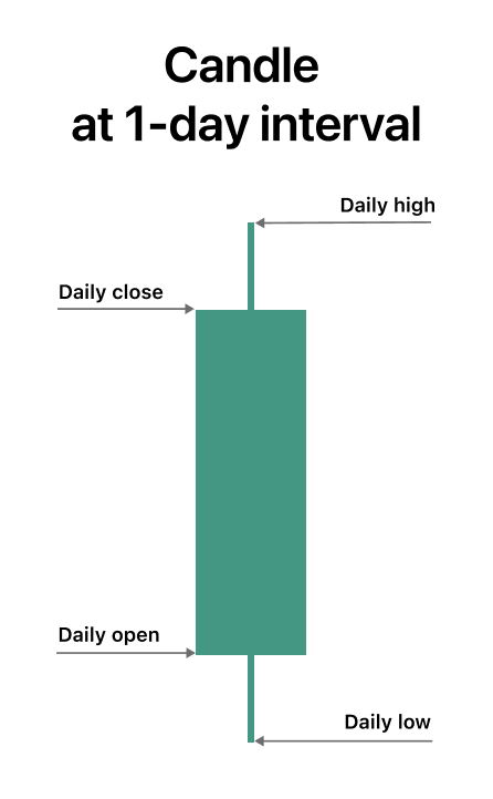 Setiap candle pada chart candlestick terdiri dari empat informasi, yang juga dikenal sebagai harga: harga pembukaan, harga tertinggi, harga terendah, dan harga penutupan. Interval menunjukkan harga-harga ini dalam rentang waktu yang dipilih, sehingga menentukan berapa lama waktu yang dibutuhkan untuk membentuk satu candlestick. Misalnya, jika interval diatur ke 1 hari, setiap candlestick akan menggunakan harga pembukaan, harga tertinggi, harga terendah, dan harga penutupan setiap hari. Dan jika Anda memilih interval 4 jam, setiap candlestick akan mencerminkan pergerakan harga dalam periode 4 jam tersebut, dengan setiap candlestick sebelumnya mewakili empat jam perdagangan sebelumnya.