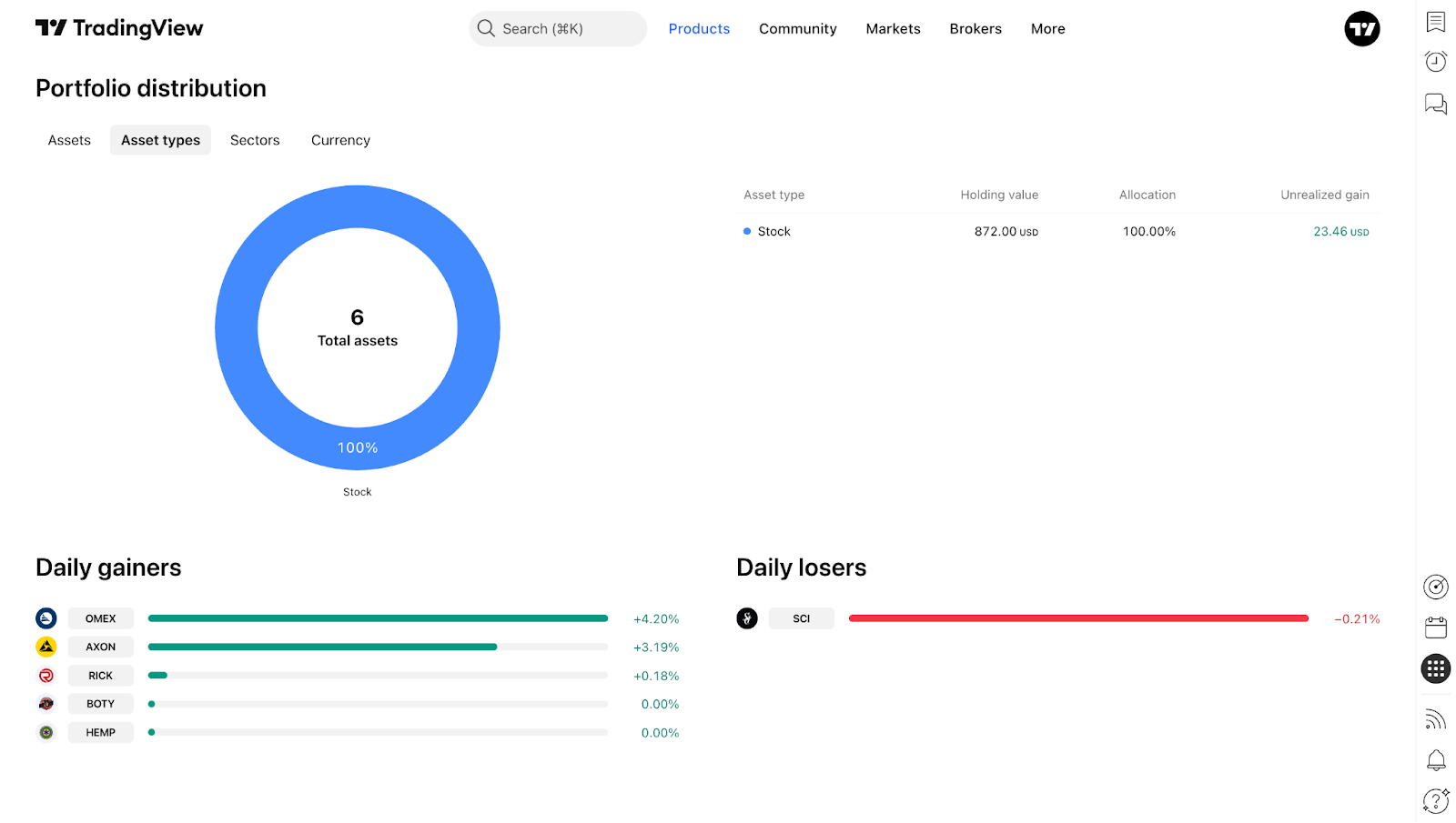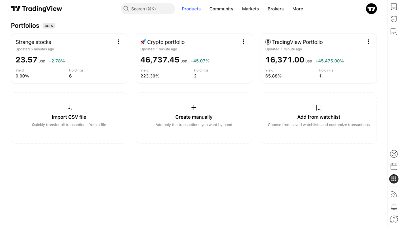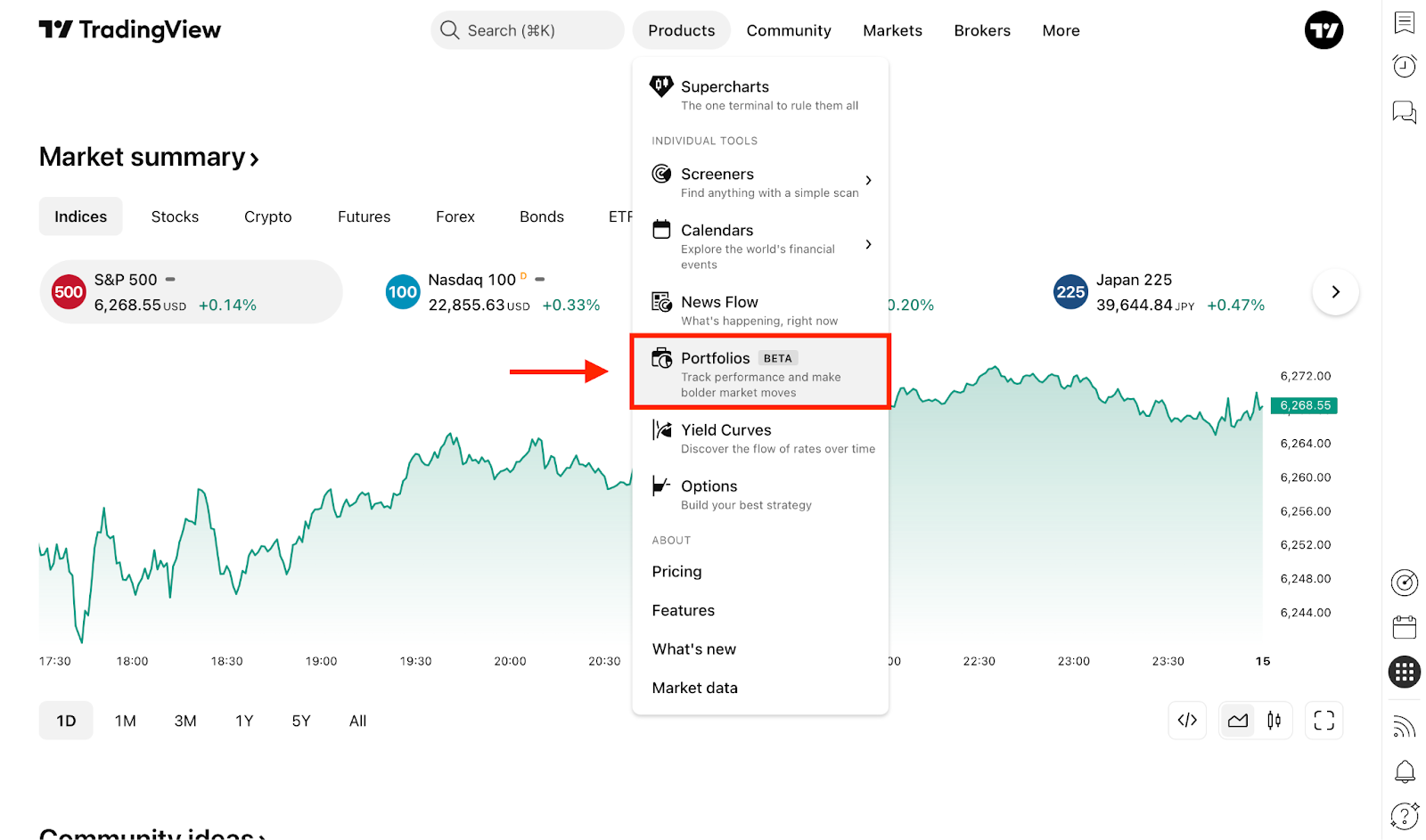 Saat Anda masuk ke akun TradingView, Anda dapat mulai membuat portofolio. Untuk melakukannya, buka Portofolio di menu "Produk".