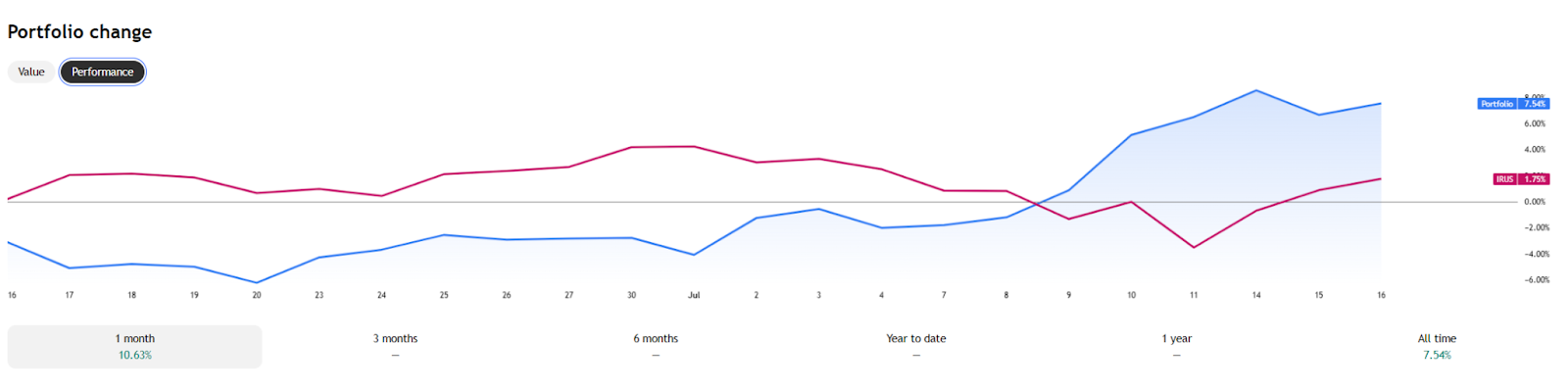 Di bagian perubahan portofolio, Anda akan melihat nilai portofolio dan keuntungan relatif setiap hari. Di sini, Anda dapat beralih di antara dua tampilan: garis nilai sederhana yang menunjukkan perubahan nilai portofolio Anda seiring waktu, atau tampilan gabungan yang mencakup kinerja portofolio dan benchmark Anda. Cukup pilih tab "Nilai" atau "Performa".