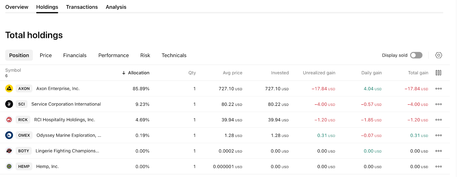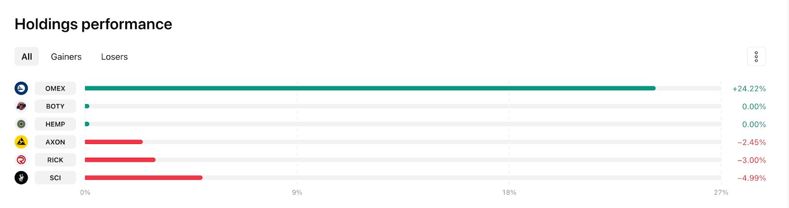 Di bagian bawah, Anda dapat menemukan kinerja kepemilikan Anda untuk menilai setiap aset relatif terhadap aset lainnya.