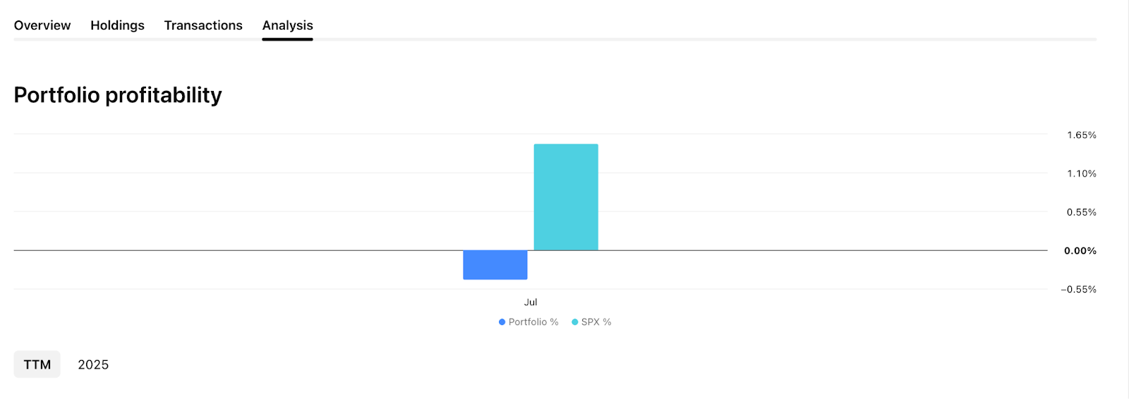 Menampilkan kinerja portofolio Anda di berbagai periode waktu. Selain itu, tab ini memberi Anda wawasan tentang tingkat risiko portofolio Anda berdasarkan beta, rasio Sharpe, atau rasio Sortino.