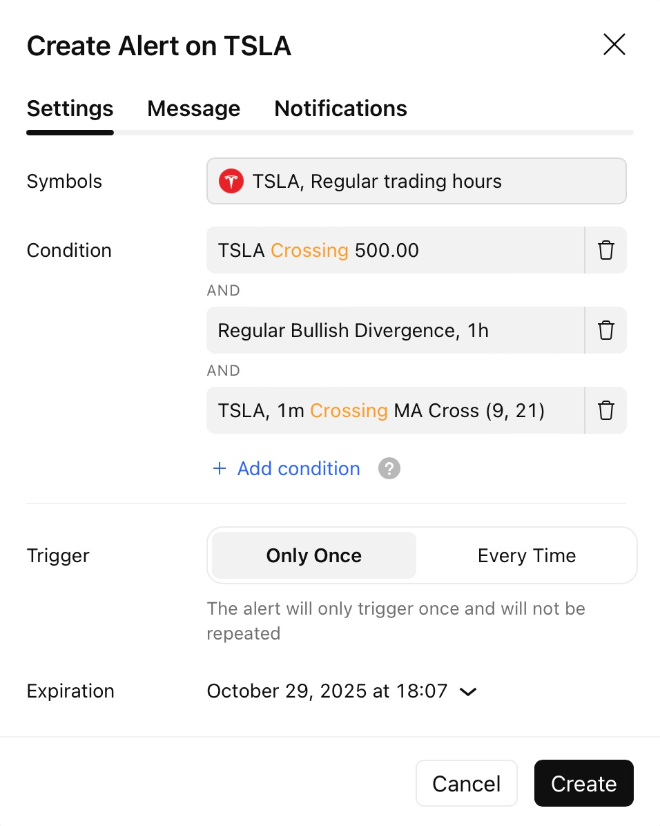 Buatlah peringatan yang memeriksa beberapa kondisi secara sekaligus — sinyal yang lebih cerdas dan presisi tanpa perlu menulis satu baris kode pun. Dengan fitur ini, Anda dapat menggabungkan hingga lima kondisi berbeda — termasuk harga, gambar, dan indikator — menjadi satu peringatan yang canggih. Peringatan hanya akan aktif ketika semua kondisi terpenuhi secara bersamaan.