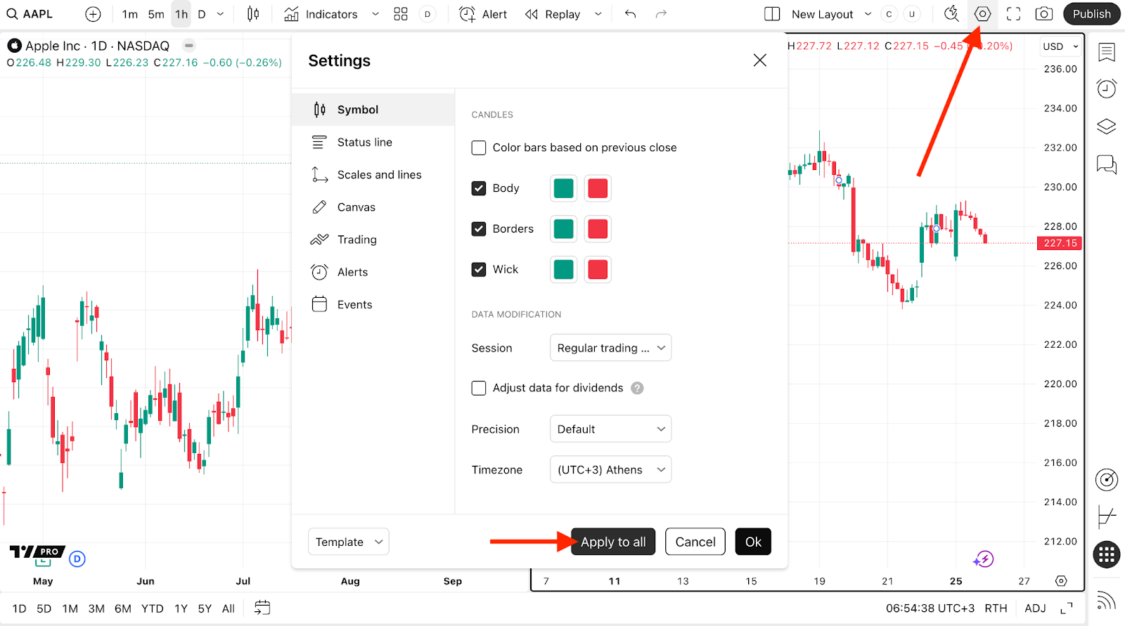 Pengaturan bersifat individual untuk setiap chart. Namun, jika Anda ingin menerapkan pengaturan chart tertentu ke semua chart lain dalam layout, cukup klik tombol "Terapkan ke semua" yang terletak di Pengaturan.