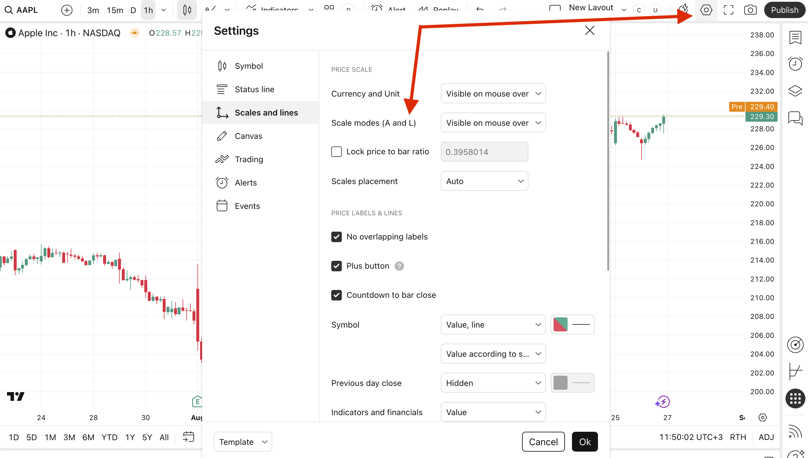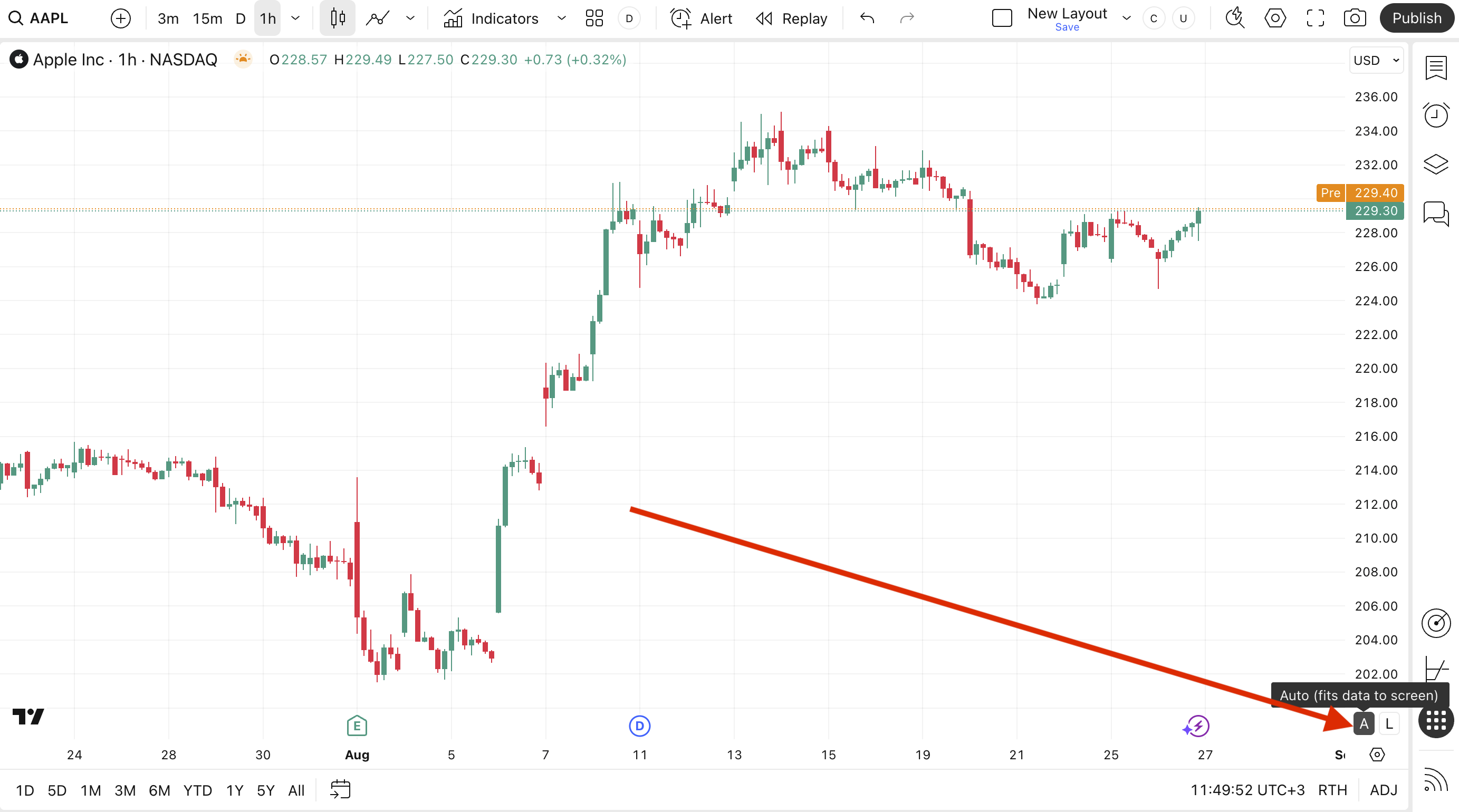 Untuk menyesuaikan data chart dengan layar, aktifkan tombol Otomatis yang terletak pada skala harga.