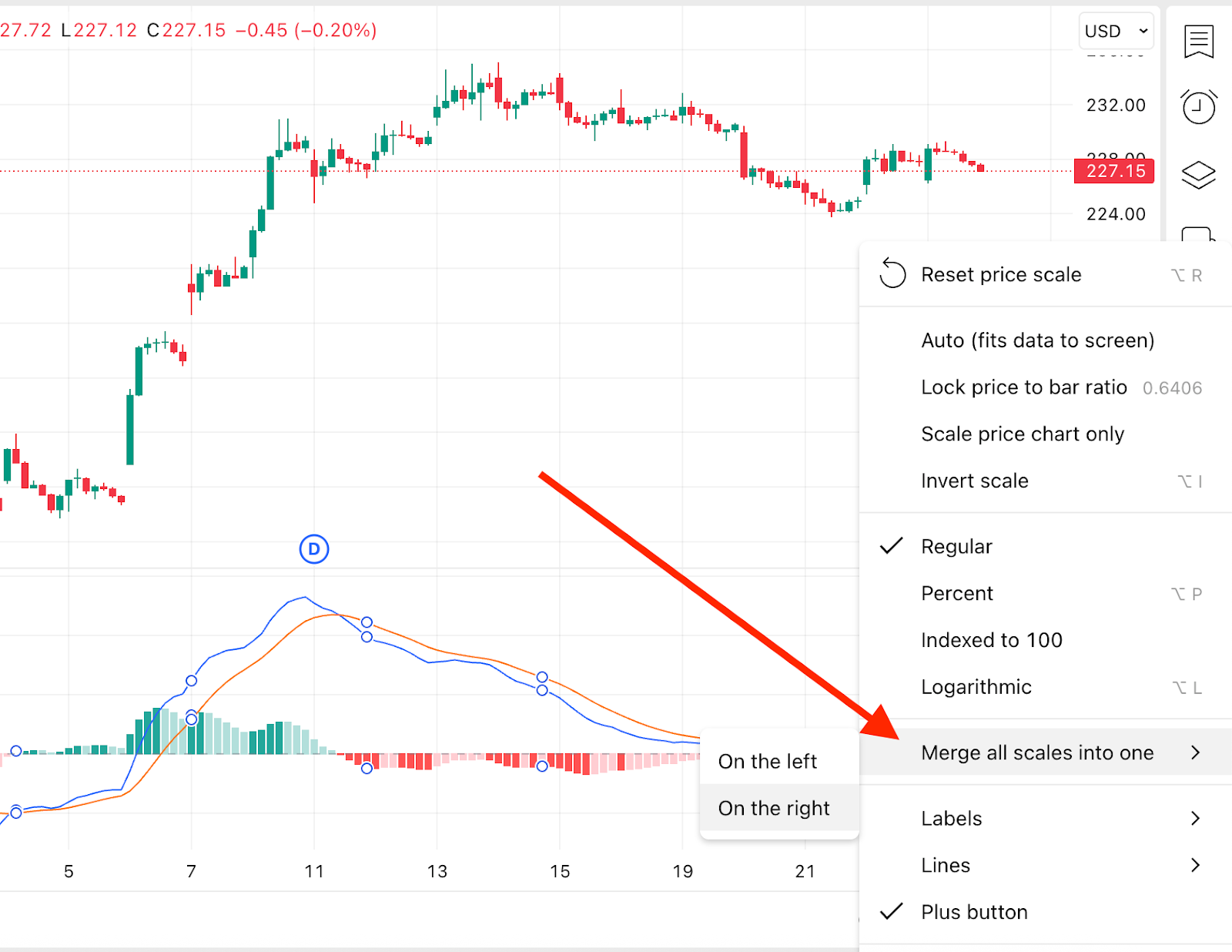 Untuk menggabungkan semua skala harga menjadi satu, cukup klik kanan pada skala harga dan pilih Gabungkan semua skala menjadi satu.