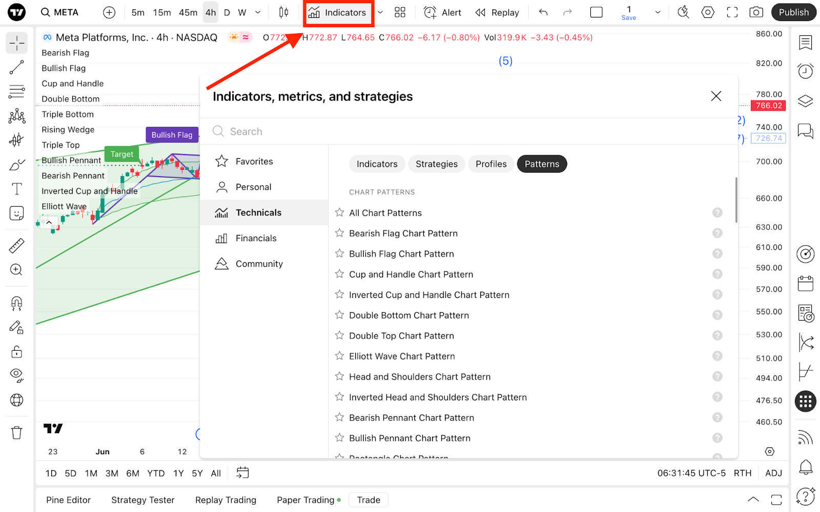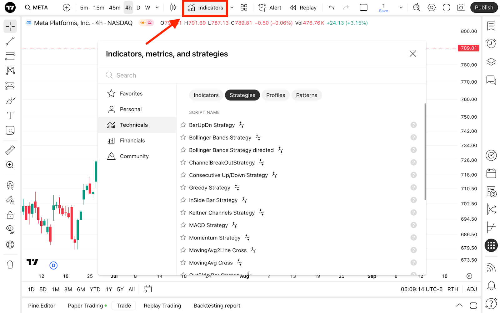 Untuk membuat peringatan untuk suatu strategi, Anda perlu memilih salah satu di jendela "Indikator, metrik, dan strategi". Di sana, buka tab "Teknikal", dan pilih "Strategi".