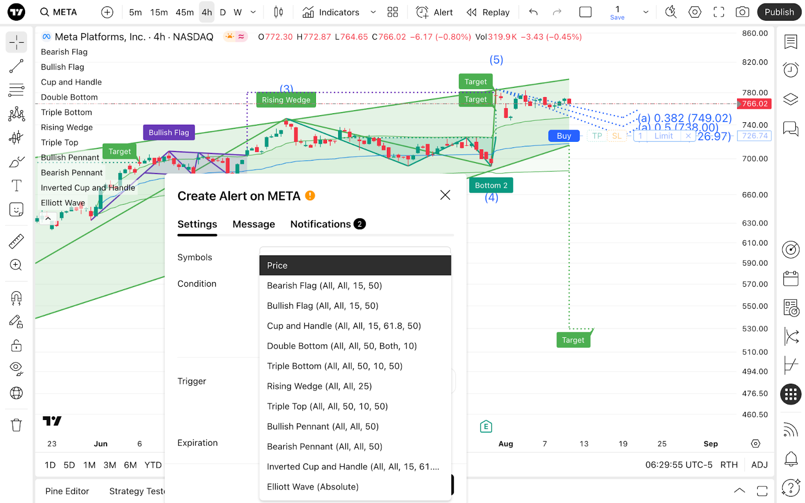 Anda dapat mengatur peringatan untuk motif chart yang terdeteksi secara otomatis. Peringatan ini mengidentifikasi penembusan motif, mengenali formasi baru, dan memberi tahu Anda tentang motif yang mencapai targetnya.