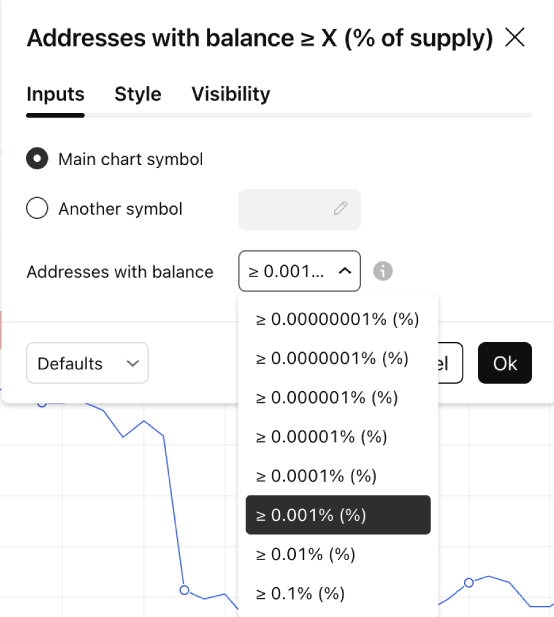 Alamat dengan saldo ≥ X (% dari suplai) mewakili jumlah alamat unik yang memegang setidaknya X persen dari total suplai mata uang crypto. Nilai bawaannya adalah X = 0,001%, tetapi pengguna dapat memilih dari beberapa ambang batas, termasuk 0,00000001%, 0,0000001%, 0,000001%, 0,00001%, 0,0001%, 0,001%, 0,01%, dan 0,1% untuk menganalisis segmen pemegang yang berbeda.