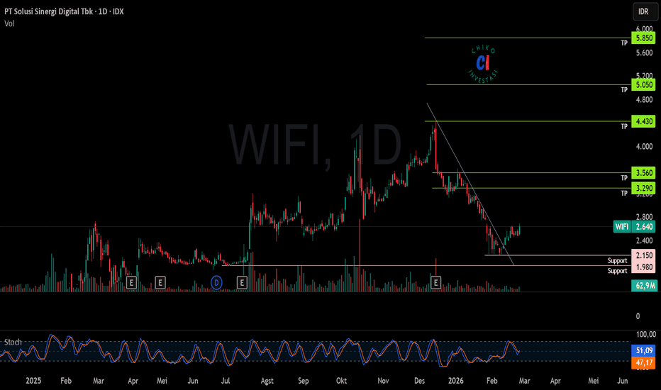 WIFIWIFI sudah keluar dari downtrend line dan membentuk v pattern, tanda awal perubahan trend menjadi bullish. Indikator stochastic mulai golden cross. WIFI cocok untuk jangka panjang.